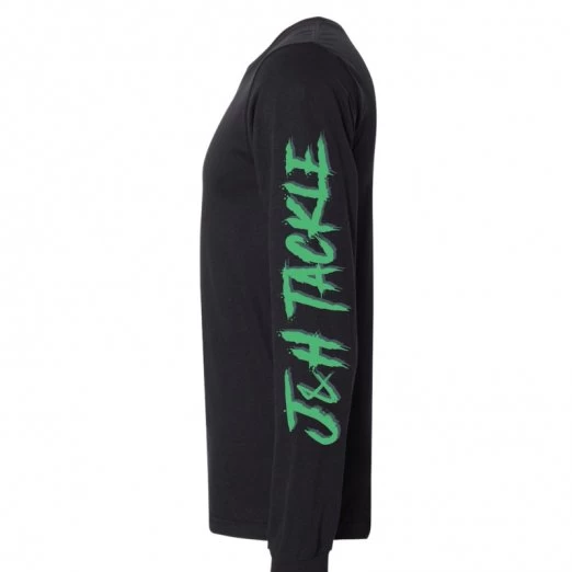 The J&H Tackle Zombie Shark Sleeve T-Shirt is the perfect shirt to wear during the Fall season. With the success of our Zombie Striped Bass shirt, we decided to tackle shark and the results speak for themselves. The zombie shark on the front is menacing and the bright green really pops! We wanted something cool on the back so one of the guys came up with the ship and graveyard on the back. It was Matt’s idea to name the ship after Harry. We kept the aggressive J&H Tackle sleeve art and there you have it. If you love fishing for shark, or just want a really cool long sleeve fishing shirt, this is it. Add a J&H Tackle Zombie Shark Sleeve T-Shirt to your wardrobe to support us. These shirts are black and are available in sizes M-3XL.
