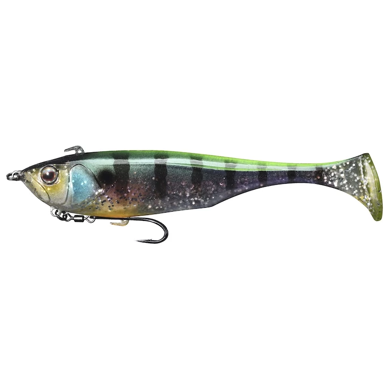 The Jackall Dunkle 7″ Swimbait is a big freshwater bass catcher! If you love targeting double digit bass, this Japanese designed swimbait will get it done! The Dunkle is a 7″ rigged sinking swimbait that has a wide front and it tapers down to a thinner tail. It has a very natural swimming motion in the water. It uses a combination of a rolling and wobbling action with moderate tail movement to attract big bass to hit it. The coolest part is the hook and hook holder. The swiveling double hook is attached to the hook holder and releases when the fish gets hooked. This reduces fish throwing the hook and will get more fish to the boat. There is another hook holder on the top of the bait which allows you to attach a stinger hook. This bait can sink to whatever depth you need but you can also attach extra weight to the front eye if you need it to sink further. The design and colors on this Jackall bait are really nice and will attract even the most finicky fish. If big bass is your game, add a Jackall Dunkle 7″ Swimbait to your arsenal and hit the water!
