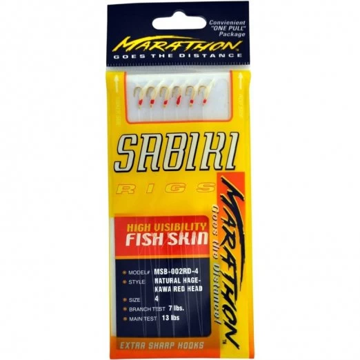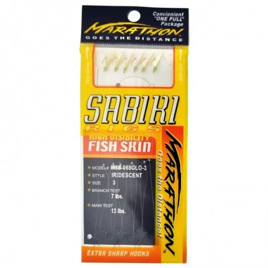 Marathon Sabiki Rigs are a Japanese innovation that are both simple to use and an incredibly effective way to catch bait! Marathon’s one pull package allows you to connect the Sabiki rig to your rod and just pull it out. It couldn’t be easier! Marathon Sabiki Rigs are constructed of mono with six extra sharp hooks with high visibility fish skin that bait fish can’t resist. Before you know it, you’ll have caught your share and will be ready to target some game fish!