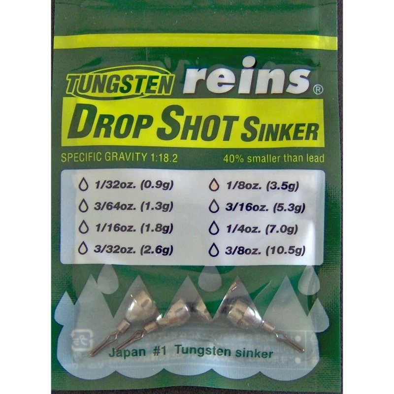 Reins Tungsten TG Drop Shot Sinker Weights are available in three weights. Choose from 3/16 oz, 1/4 oz and 3/8 oz. They come 2 pieces to a pack and are natural in color.