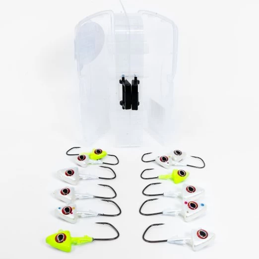 The S&S Fishaholic TRI Jig Head Bundle is the perfect assortment of these very popular jig heads. These triangle shaped jig heads are designed by Rich “Fishaholic” Janitschek. They are made in the USA and feature super sharp Owner Barbarian hooks. They are hand painted with multiple coats and the 3D eyes are covered in two layers of epoxy so they won’t come off. These jig heads are next level and now you can get a set of them in a convenient hard plastic case from Plano.
